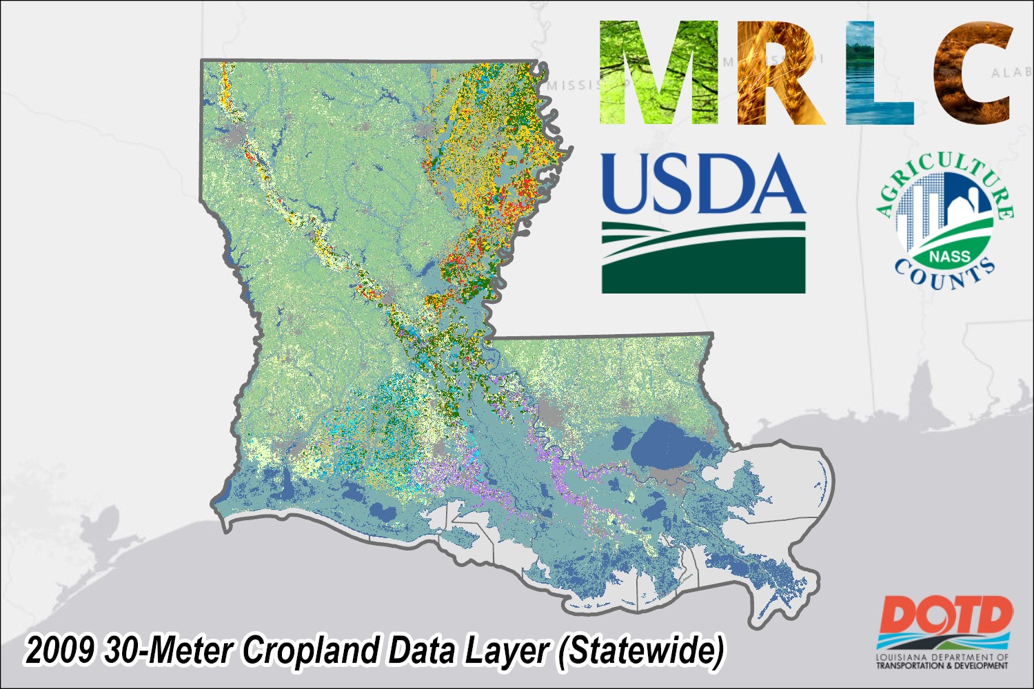 Description: This 2009 Cropland Data Layer Imagery Product has been provided by USDA and is hosted as an image service by Louisiana DOTD. This service has a spatial resolution of approximately 30-Meter(s) and an extent covering statewide areas of interest. The source data for this service has horizontal coordinate system 'WGS 1984 Web Mercator (auxiliary sphere) (EPSG:3857)'. The source data is in Raster Dataset format. The no data value for this data is 0. The source data bit depth is 8-Bit Unsigned. This data is not available for download. The USDA-NASS Cropland Data Layer (CDL) is an annual raster, geo-referenced, crop-specific land cover data layer. The data layer is aggregated to a possible 85 standardized categories for display purposes, with the emphasis being agricultural land cover. Most data layers average about 10 to 20 categories out of the 85 possible categories.For more information on this data please visit https://www.nass.usda.gov/Research_and_Science/Cropland/Release/This data has been developed from the best available sources to ensure accuracy and reliability; however, the entire risk as to the quality and performance of the data is assumed by the user. The data herein, including but not limited to geographic data, tabular data, analytical data, electronic data structures or files, are provided 'as is' without warranty of any kind, either expressed or implied, including, but not limited to, the implied warranties of merchantability and fitness for a particular purpose. In no event shall the LADOTD be liable for direct, indirect, incidental, consequential or specific damages of any kind, including, but not limited to, loss of anticipated profits or benefits arising out of use of or reliance on the data. The user should refer to the accompanying metadata notes for a description of the data and data development procedures. The data may not be suitable for all high-precision measurement applications such as property transfers or other uses that might require highly accurate measurements of the earth's surface. Distribution of the data is intended for informational purposes and should not be considered authoritative for navigational, engineering, legal or other site-specific uses. The data is provided free to use in any product or publication, however no warranty, expressed or implied is made with regard to the accuracy of data or the spatial accuracy, and LADOTD accepts no liability for any damages or misrepresentation caused by inaccuracies in the data or as a result of changes to the data caused by system transfers or other transformations or conversions, nor is there responsibility assumed to maintain the data in any manner or form.