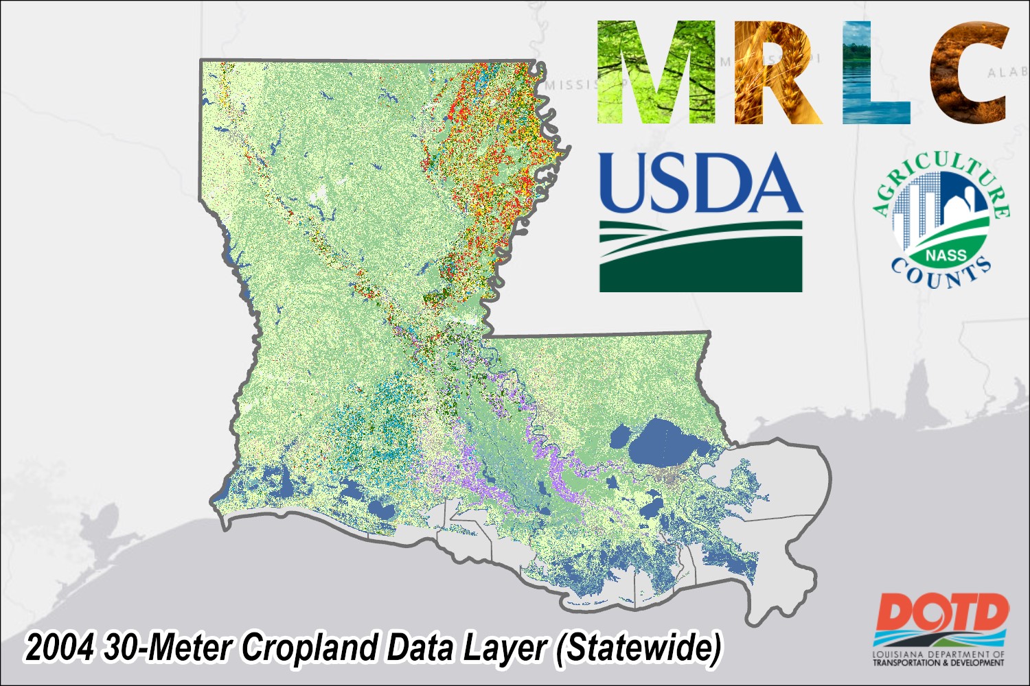 Description: This 2004 Cropland Data Layer Imagery Product has been provided by USDA and is hosted as an image service by Louisiana DOTD. This service has a spatial resolution of approximately 30-Meter(s) and an extent covering statewide areas of interest. The source data for this service has horizontal coordinate system 'WGS 1984 Web Mercator (auxiliary sphere) (EPSG:3857)'. The source data is in Raster Dataset format. The no data value for this data is 0. The source data bit depth is 8-Bit Unsigned. This data is not available for download. The USDA-NASS Cropland Data Layer (CDL) is an annual raster, geo-referenced, crop-specific land cover data layer. The data layer is aggregated to a possible 85 standardized categories for display purposes, with the emphasis being agricultural land cover. Most data layers average about 10 to 20 categories out of the 85 possible categories.For more information on this data please visit https://www.nass.usda.gov/Research_and_Science/Cropland/Release/This data has been developed from the best available sources to ensure accuracy and reliability; however, the entire risk as to the quality and performance of the data is assumed by the user. The data herein, including but not limited to geographic data, tabular data, analytical data, electronic data structures or files, are provided 'as is' without warranty of any kind, either expressed or implied, including, but not limited to, the implied warranties of merchantability and fitness for a particular purpose. In no event shall the LADOTD be liable for direct, indirect, incidental, consequential or specific damages of any kind, including, but not limited to, loss of anticipated profits or benefits arising out of use of or reliance on the data. The user should refer to the accompanying metadata notes for a description of the data and data development procedures. The data may not be suitable for all high-precision measurement applications such as property transfers or other uses that might require highly accurate measurements of the earth's surface. Distribution of the data is intended for informational purposes and should not be considered authoritative for navigational, engineering, legal or other site-specific uses. The data is provided free to use in any product or publication, however no warranty, expressed or implied is made with regard to the accuracy of data or the spatial accuracy, and LADOTD accepts no liability for any damages or misrepresentation caused by inaccuracies in the data or as a result of changes to the data caused by system transfers or other transformations or conversions, nor is there responsibility assumed to maintain the data in any manner or form.
