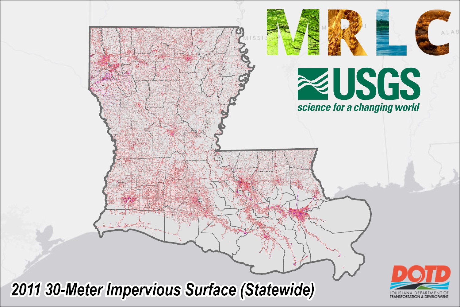 Description: This 2011 Impervious Surface Imagery Product has been provided by USGS and is hosted as an image service by Louisiana DOTD. This service has a spatial resolution of approximately 30-Meter(s) and an extent covering statewide areas of interest. The source data for this service has horizontal coordinate system 'WGS 1984 Web Mercator (auxiliary sphere) (EPSG:3857)'. The source data is in Raster Dataset format. The no data value for this data is 0. The source data bit depth is 8-Bit Unsigned. This data is not available for download. The National Land Cover Database (NLCD) imperviousness products represent urban impervious surfaces as a percentage of developed surface over every 30-meter pixel in the United States.For more information on this data please visit https://www.mrlc.gov/dataThis data has been developed from the best available sources to ensure accuracy and reliability; however, the entire risk as to the quality and performance of the data is assumed by the user. The data herein, including but not limited to geographic data, tabular data, analytical data, electronic data structures or files, are provided 'as is' without warranty of any kind, either expressed or implied, including, but not limited to, the implied warranties of merchantability and fitness for a particular purpose. In no event shall the LADOTD be liable for direct, indirect, incidental, consequential or specific damages of any kind, including, but not limited to, loss of anticipated profits or benefits arising out of use of or reliance on the data. The user should refer to the accompanying metadata notes for a description of the data and data development procedures. The data may not be suitable for all high-precision measurement applications such as property transfers or other uses that might require highly accurate measurements of the earth's surface. Distribution of the data is intended for informational purposes and should not be considered authoritative for navigational, engineering, legal or other site-specific uses. The data is provided free to use in any product or publication, however no warranty, expressed or implied is made with regard to the accuracy of data or the spatial accuracy, and LADOTD accepts no liability for any damages or misrepresentation caused by inaccuracies in the data or as a result of changes to the data caused by system transfers or other transformations or conversions, nor is there responsibility assumed to maintain the data in any manner or form.