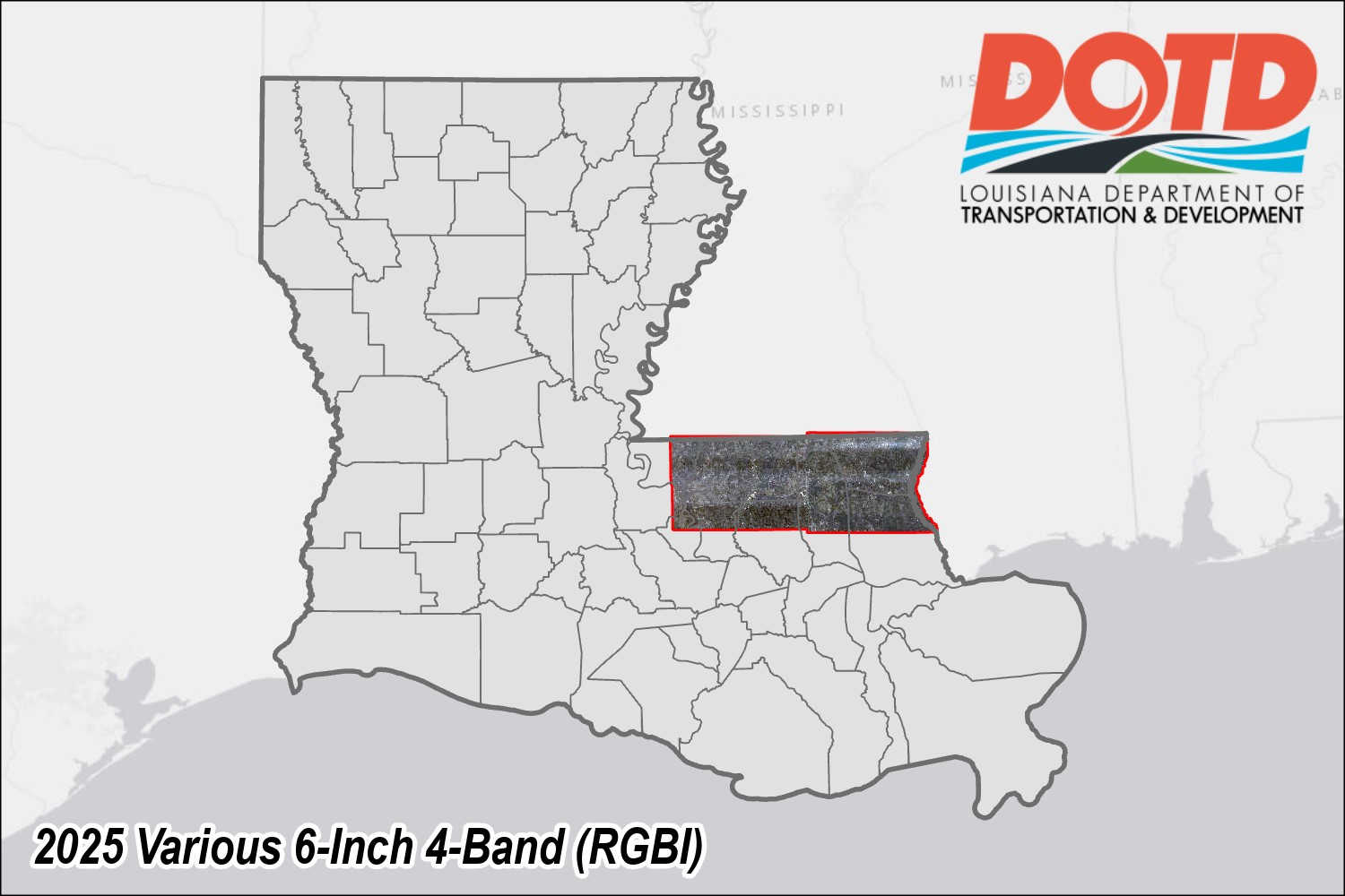 Description: This 2025 4-Band (RGBI) Aerial Imagery has been provided by DOTD and is hosted as an image service by Louisiana DOTD. This service has a spatial resolution of approximately 6-Inch(s) and an extent covering Various areas of interest. This data has been tiled into 1500-meter cells based on the US National Grid (USNG). The source data for this service has horizontal coordinate system 'WGS 1984 Web Mercator (auxiliary sphere) (EPSG:3857)' and vertical coordinate system ''. The source data is in TIF format. The no data value for this data is 0. The source data bit depth is 8-Bit Unsigned. This data is available for download. This data was provided to Louisiana DOTD by a commercial vendor and has been made publicly available.For more information on this and other data provided by DOTD please visit https://data-ladotd.opendata.arcgis.comThis data has been developed from the best available sources to ensure accuracy and reliability; however, the entire risk as to the quality and performance of the data is assumed by the user. The data herein, including but not limited to geographic data, tabular data, analytical data, electronic data structures or files, are provided 'as is' without warranty of any kind, either expressed or implied, including, but not limited to, the implied warranties of merchantability and fitness for a particular purpose. In no event shall the LADOTD be liable for direct, indirect, incidental, consequential or specific damages of any kind, including, but not limited to, loss of anticipated profits or benefits arising out of use of or reliance on the data. The user should refer to the accompanying metadata notes for a description of the data and data development procedures. The data may not be suitable for all high-precision measurement applications such as property transfers or other uses that might require highly accurate measurements of the earth's surface. Distribution of the data is intended for informational purposes and should not be considered authoritative for navigational, engineering, legal or other site-specific uses. The data is provided free to use in any product or publication, however no warranty, expressed or implied is made with regard to the accuracy of data or the spatial accuracy, and LADOTD accepts no liability for any damages or misrepresentation caused by inaccuracies in the data or as a result of changes to the data caused by system transfers or other transformations or conversions, nor is there responsibility assumed to maintain the data in any manner or form.