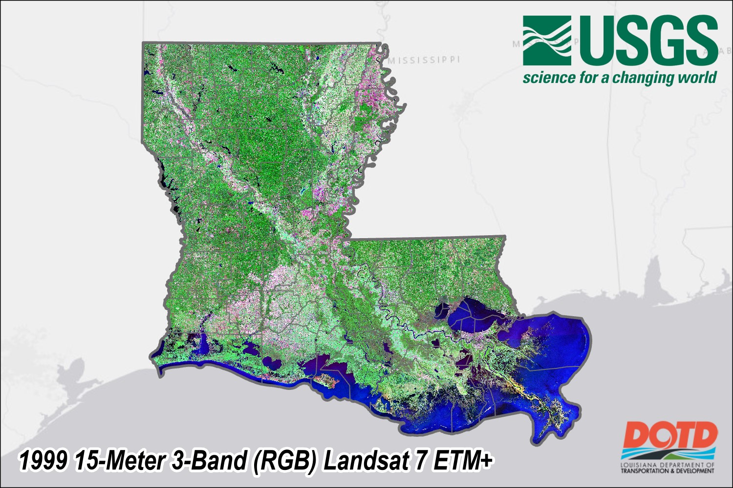 Description: This 1999 Landsat 7 Composite Imagery Product has been provided by USGS and is hosted as an image service by Louisiana DOTD. This service has a spatial resolution of approximately 15-Meter(s) and an extent covering statewide areas of interest. The source data for this service has horizontal coordinate system 'NAD 1983 (2011) UTM Zone 15N (EPSG:6344)' and vertical coordinate system 'NAVD88 height - GEOID12B (EPSG: Custom)'. The source data is in TIF format. The no data value for this data is 256. The source data bit depth is 16-Bit Unsigned. This data is not available for download. The Landsat program is the longest-running enterprise for acquisition of satellite imagery of Earth. It is a joint NASA / USGS program. The instruments on the Landsat satellites have acquired millions of images. The images, archived in the United States and at Landsat receiving stations around the world, are a unique resource for global change research and applications in agriculture, cartography, geology, forestry, regional planning, surveillance and education, and can be viewed through the U.S. Geological Survey (USGS) ""EarthExplorer"" website. This data is a pansharpened mosaic composite of the visible bands from Landsat 7 Enhanced Thematic Mapper (ETM+) data from 1999-2003. For more information on this data please visit https://earthexplorer.usgs.gov/This data has been developed from the best available sources to ensure accuracy and reliability; however, the entire risk as to the quality and performance of the data is assumed by the user. The data herein, including but not limited to geographic data, tabular data, analytical data, electronic data structures or files, are provided 'as is' without warranty of any kind, either expressed or implied, including, but not limited to, the implied warranties of merchantability and fitness for a particular purpose. In no event shall the LADOTD be liable for direct, indirect, incidental, consequential or specific damages of any kind, including, but not limited to, loss of anticipated profits or benefits arising out of use of or reliance on the data. The user should refer to the accompanying metadata notes for a description of the data and data development procedures. The data may not be suitable for all high-precision measurement applications such as property transfers or other uses that might require highly accurate measurements of the earth's surface. Distribution of the data is intended for informational purposes and should not be considered authoritative for navigational, engineering, legal or other site-specific uses. The data is provided free to use in any product or publication, however no warranty, expressed or implied is made with regard to the accuracy of data or the spatial accuracy, and LADOTD accepts no liability for any damages or misrepresentation caused by inaccuracies in the data or as a result of changes to the data caused by system transfers or other transformations or conversions, nor is there responsibility assumed to maintain the data in any manner or form.