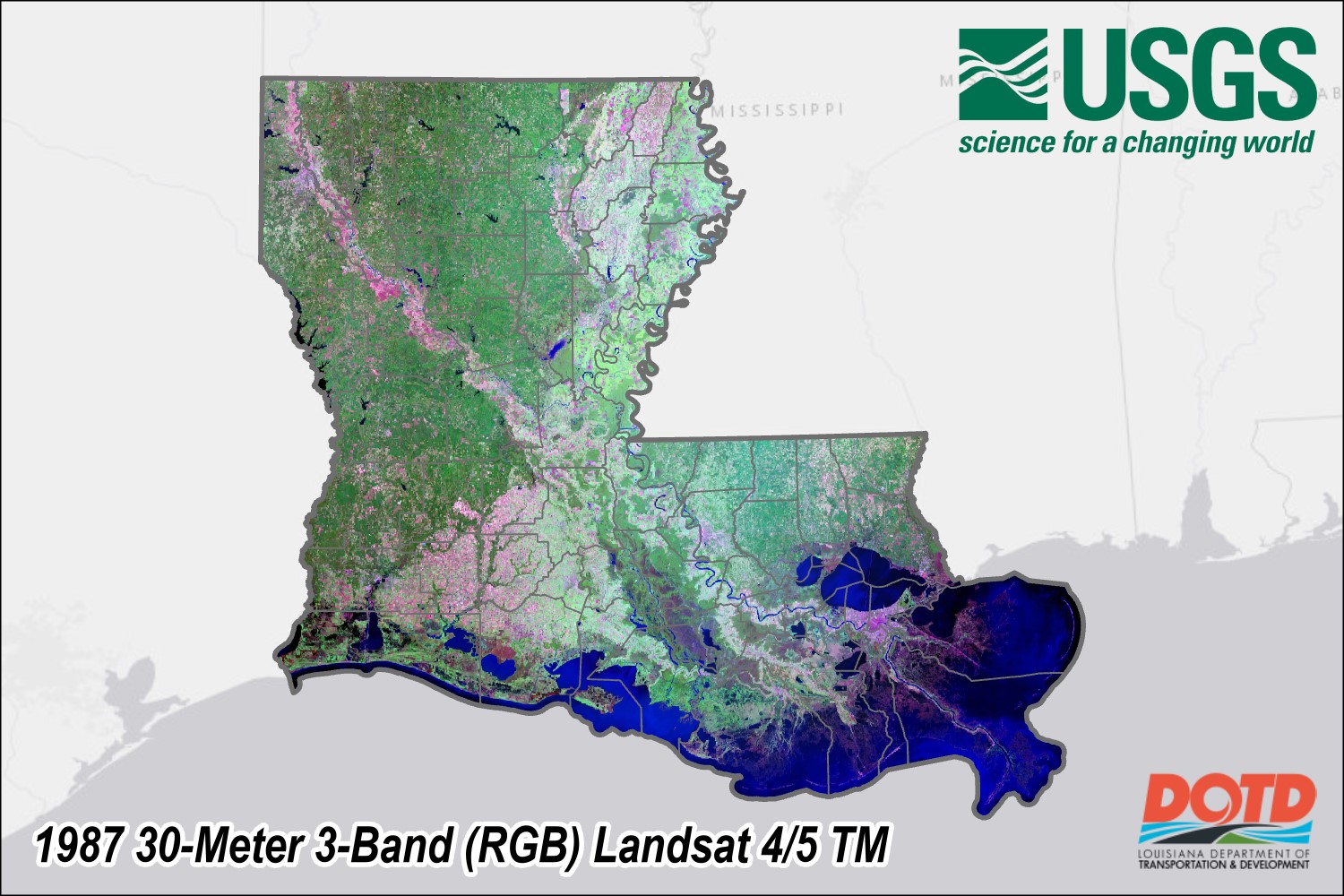 Description: This 1987 Landsat 5 Composite Imagery Product has been provided by USGS and is hosted as an image service by Louisiana DOTD. This service has a spatial resolution of approximately 30-Meter(s) and an extent covering statewide areas of interest. The source data for this service has horizontal coordinate system 'WGS 1984 Web Mercator (auxiliary sphere) (EPSG:3857)'. The source data is in TIF format. The no data value for this data is 0. The source data bit depth is 8-Bit Unsigned. This data is not available for download. The Landsat program is the longest-running enterprise for acquisition of satellite imagery of Earth. It is a joint NASA / USGS program. The instruments on the Landsat satellites have acquired millions of images. The images, archived in the United States and at Landsat receiving stations around the world, are a unique resource for global change research and applications in agriculture, cartography, geology, forestry, regional planning, surveillance and education, and can be viewed through the U.S. Geological Survey (USGS) ""EarthExplorer"" website. This data is a mosaic composite of the visible bands from Landsat 4 and Landsat 5 Thematic Mapper (TM) data in the late 1980s. For more information on this data please visit https://earthexplorer.usgs.gov/This data has been developed from the best available sources to ensure accuracy and reliability; however, the entire risk as to the quality and performance of the data is assumed by the user. The data herein, including but not limited to geographic data, tabular data, analytical data, electronic data structures or files, are provided 'as is' without warranty of any kind, either expressed or implied, including, but not limited to, the implied warranties of merchantability and fitness for a particular purpose. In no event shall the LADOTD be liable for direct, indirect, incidental, consequential or specific damages of any kind, including, but not limited to, loss of anticipated profits or benefits arising out of use of or reliance on the data. The user should refer to the accompanying metadata notes for a description of the data and data development procedures. The data may not be suitable for all high-precision measurement applications such as property transfers or other uses that might require highly accurate measurements of the earth's surface. Distribution of the data is intended for informational purposes and should not be considered authoritative for navigational, engineering, legal or other site-specific uses. The data is provided free to use in any product or publication, however no warranty, expressed or implied is made with regard to the accuracy of data or the spatial accuracy, and LADOTD accepts no liability for any damages or misrepresentation caused by inaccuracies in the data or as a result of changes to the data caused by system transfers or other transformations or conversions, nor is there responsibility assumed to maintain the data in any manner or form.