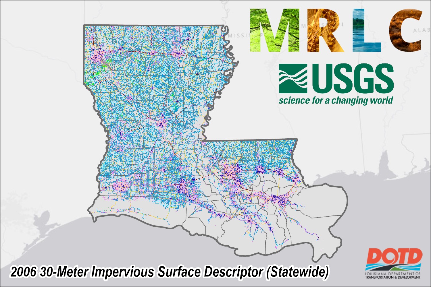 Description: This 2006 Impervious Surface Descriptor Imagery Product has been provided by USGS and is hosted as an image service by Louisiana DOTD. This service has a spatial resolution of approximately 30-Meter(s) and an extent covering statewide areas of interest. The source data for this service has horizontal coordinate system 'WGS 1984 Web Mercator (auxiliary sphere) (EPSG:3857)'. The source data is in Raster Dataset format. The no data value for this data is 0. The source data bit depth is 8-Bit Unsigned. This data is not available for download. The National Land Cover Database (NLCD) imperviousness products represent urban impervious surfaces as a percentage of developed surface over every 30-meter pixel in the United States. This descriptor layer identifies types of roads, core urban areas, and energy production sites for each impervious pixel to allow deeper analysis of developed features.For more information on this data please visit https://www.mrlc.gov/dataThis data has been developed from the best available sources to ensure accuracy and reliability; however, the entire risk as to the quality and performance of the data is assumed by the user. The data herein, including but not limited to geographic data, tabular data, analytical data, electronic data structures or files, are provided 'as is' without warranty of any kind, either expressed or implied, including, but not limited to, the implied warranties of merchantability and fitness for a particular purpose. In no event shall the LADOTD be liable for direct, indirect, incidental, consequential or specific damages of any kind, including, but not limited to, loss of anticipated profits or benefits arising out of use of or reliance on the data. The user should refer to the accompanying metadata notes for a description of the data and data development procedures. The data may not be suitable for all high-precision measurement applications such as property transfers or other uses that might require highly accurate measurements of the earth's surface. Distribution of the data is intended for informational purposes and should not be considered authoritative for navigational, engineering, legal or other site-specific uses. The data is provided free to use in any product or publication, however no warranty, expressed or implied is made with regard to the accuracy of data or the spatial accuracy, and LADOTD accepts no liability for any damages or misrepresentation caused by inaccuracies in the data or as a result of changes to the data caused by system transfers or other transformations or conversions, nor is there responsibility assumed to maintain the data in any manner or form.