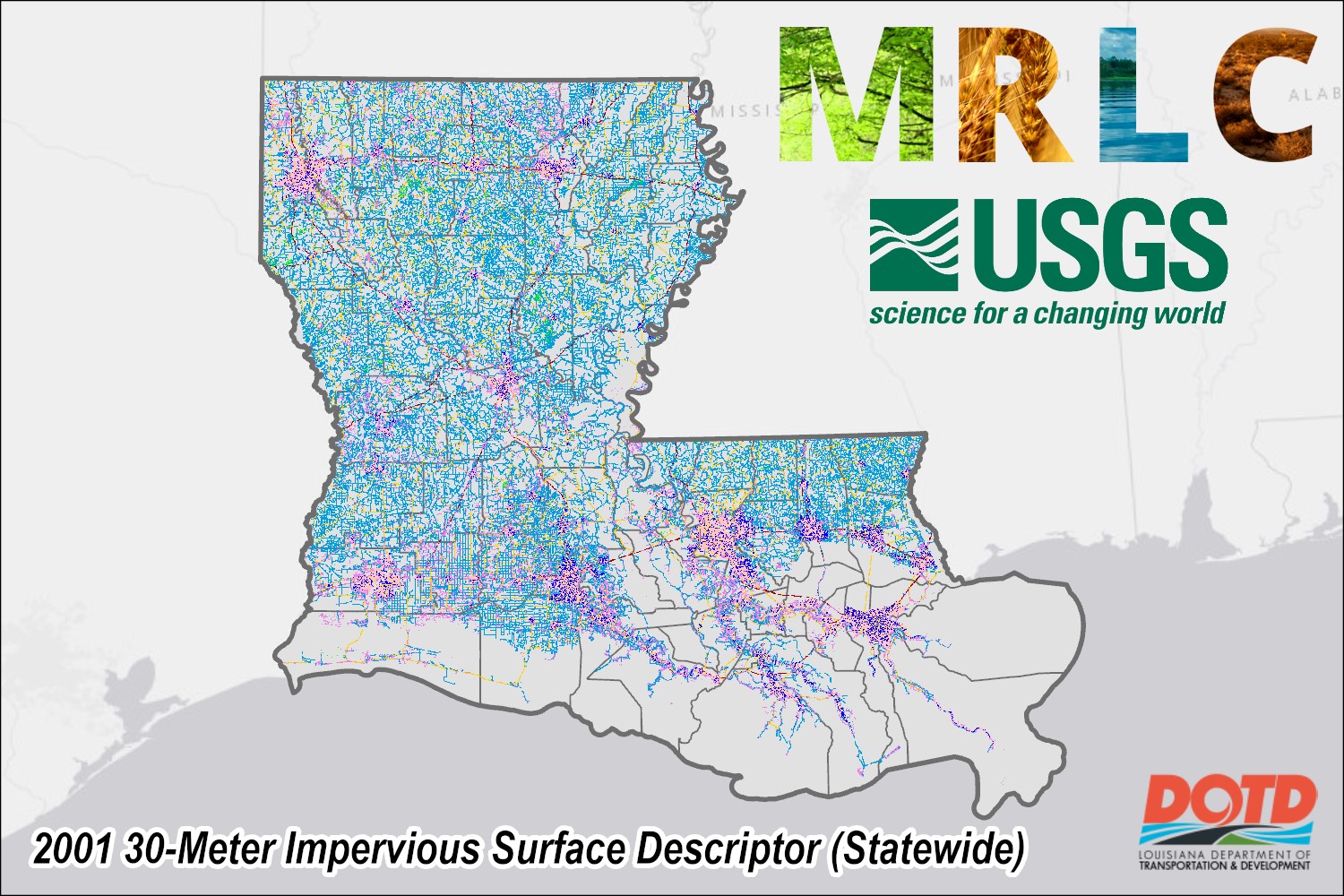 Description: This 2001 Impervious Surface Descriptor Imagery Product has been provided by USGS and is hosted as an image service by Louisiana DOTD. This service has a spatial resolution of approximately 30-Meter(s) and an extent covering statewide areas of interest. The source data for this service has horizontal coordinate system 'WGS 1984 Web Mercator (auxiliary sphere) (EPSG:3857)'. The source data is in Raster Dataset format. The no data value for this data is 0. The source data bit depth is 8-Bit Unsigned. This data is not available for download. The National Land Cover Database (NLCD) imperviousness products represent urban impervious surfaces as a percentage of developed surface over every 30-meter pixel in the United States. This descriptor layer identifies types of roads, core urban areas, and energy production sites for each impervious pixel to allow deeper analysis of developed features.For more information on this data please visit https://www.mrlc.gov/dataThis data has been developed from the best available sources to ensure accuracy and reliability; however, the entire risk as to the quality and performance of the data is assumed by the user. The data herein, including but not limited to geographic data, tabular data, analytical data, electronic data structures or files, are provided 'as is' without warranty of any kind, either expressed or implied, including, but not limited to, the implied warranties of merchantability and fitness for a particular purpose. In no event shall the LADOTD be liable for direct, indirect, incidental, consequential or specific damages of any kind, including, but not limited to, loss of anticipated profits or benefits arising out of use of or reliance on the data. The user should refer to the accompanying metadata notes for a description of the data and data development procedures. The data may not be suitable for all high-precision measurement applications such as property transfers or other uses that might require highly accurate measurements of the earth's surface. Distribution of the data is intended for informational purposes and should not be considered authoritative for navigational, engineering, legal or other site-specific uses. The data is provided free to use in any product or publication, however no warranty, expressed or implied is made with regard to the accuracy of data or the spatial accuracy, and LADOTD accepts no liability for any damages or misrepresentation caused by inaccuracies in the data or as a result of changes to the data caused by system transfers or other transformations or conversions, nor is there responsibility assumed to maintain the data in any manner or form.